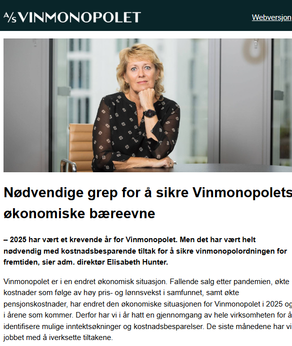 Vinmonopolets ledelse er imidlertid tydelige på at det ikke finnes reelle alternativer dersom monopolets legitimitet og økonomiske bæreevne skal bevares over tid. Administrerende direktør Elisabeth Hunter uttaler at 2025 har vært et krevende år, og at lønnsom drift er en absolutt forutsetning for at vinmonopolordningen skal bestå. Hun legger ikke skjul på at prosessen har vært smertefull internt. Det er inngått sluttavtaler med 30 medarbeidere på kjedekontoret, og det er kuttet i alt fra intern møtevirksomhet til velferdsgoder